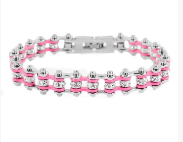 1/2" Wide MINI MINI SIZE Two Tone Silver Pink With White Crystal Centers Stainless Steel Motorcycle Bike Chain Bracelet