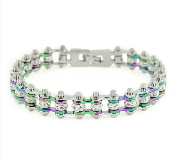 3/8" Wide MINI MINI SIZE Two Tone Silver Rainbow With White Crystal Centers Stainless Steel Motorcycle Bike Chain Bracelet