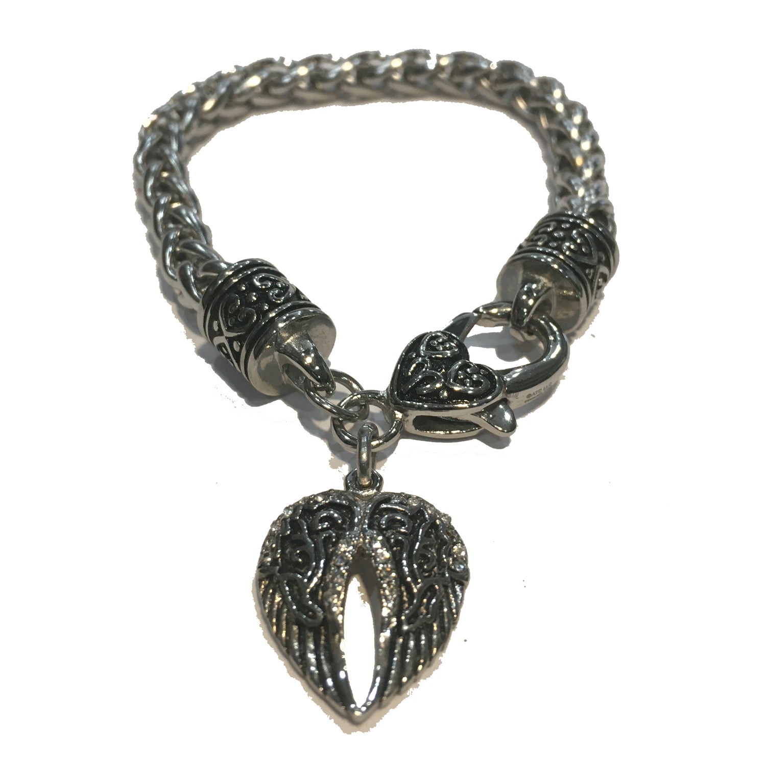 ANGEL WING ANTIQUE WITH CLEAR CRYSTALS CHARM BRACELET LADIES WITH HEART CLASP WIDE CHAIN STAINLESS STEEL