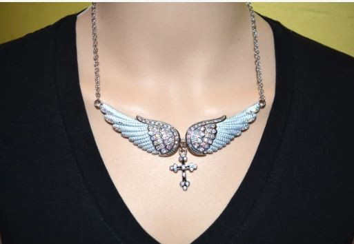 White Painted Winged Necklace With Cross White Imitation Crystals