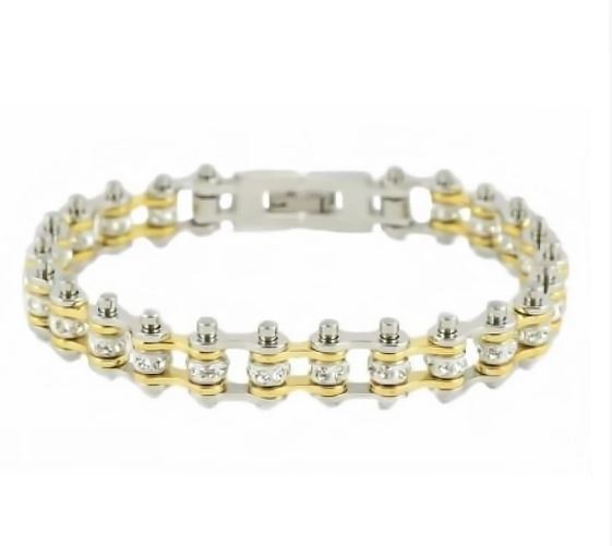 1/2" Wide MINI MINI SIZE Two Tone Silver Gold With White Crystal Centers Stainless Steel Motorcycle Bike Chain Bracelet