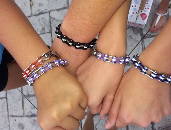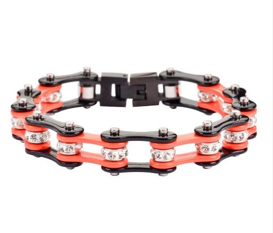 1/2" Wide Two Tone Orange Black With White Crystal Centers Stainless Steel Motorcycle Bike Chain Bracelet