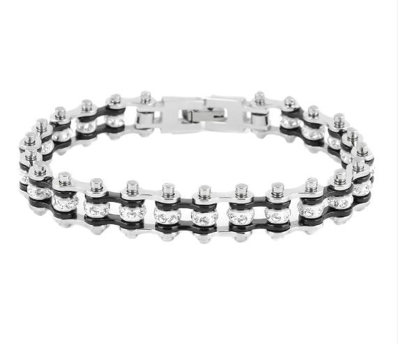 3/8" Wide MINI MINI SIZE Two Tone Silver Black With White Crystal Centers Stainless Steel Motorcycle Bike Chain Bracelet