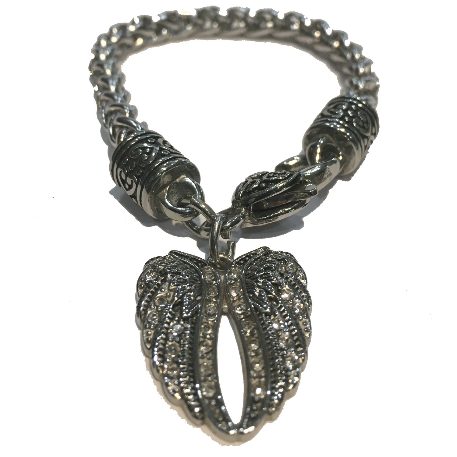 DOUBLE ANGEL WING WITH ALL CLEAR CRYSTALS CHARM BRACELET LADIES WITH HEART CLASP THIN CHAIN STAINLESS STEEL