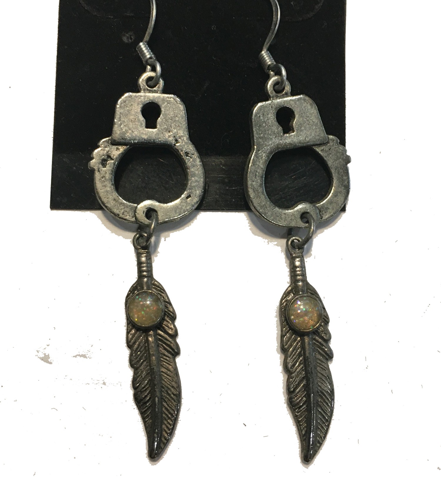 HANDCUFF SINGLE WITH FEATHER WITH OPAL ACCENT EARRINGS STAINLESS STEEL