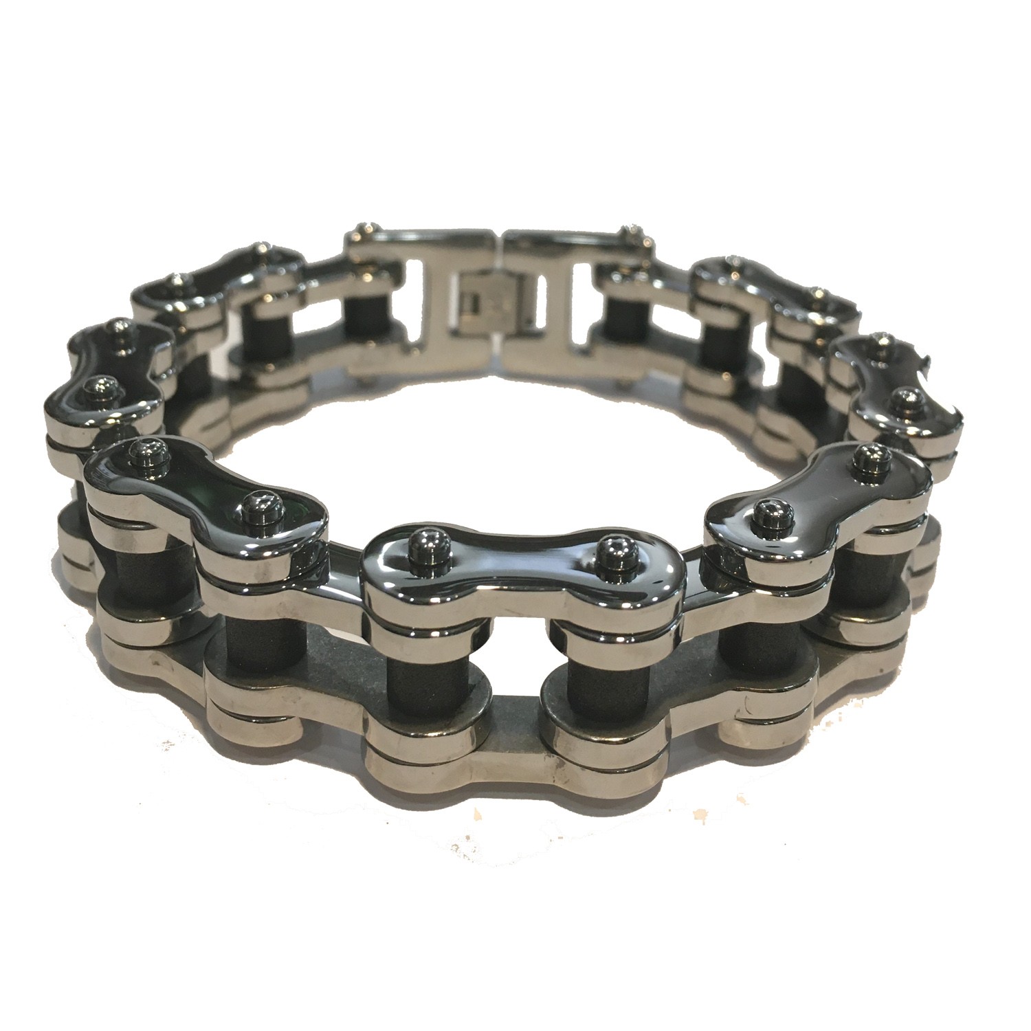 SHINY SILVER WITH BLACK CENTER MENS MOTORCYCLE CHAIN BRACELET STAINLESS STEEL 9-1/4" X 3/4"