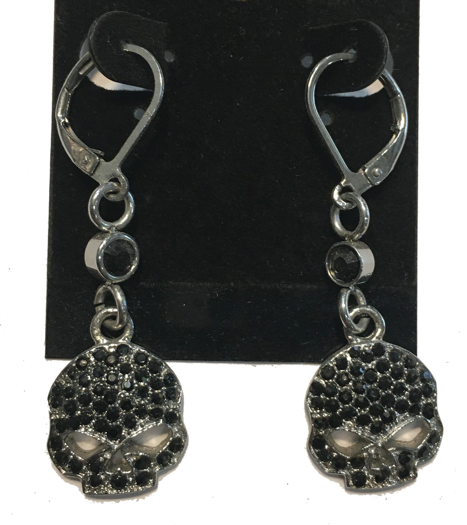 SKULL BLACK CRYSTAL DANGLE LATCHBACK EARRINGS STAINLESS STEEL
