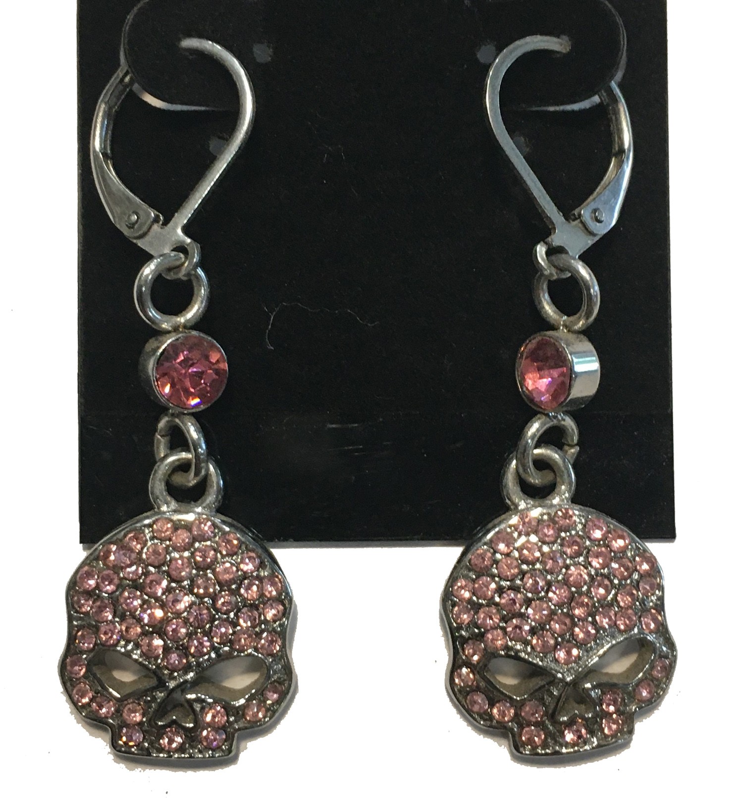 SKULL PINK CRYSTAL DANGLE LATCHBACK EARRINGS STAINLESS STEEL