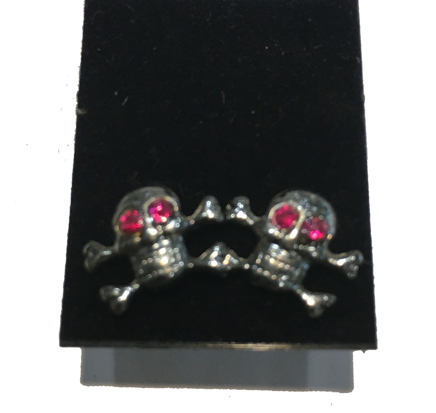 SKULL WITH BONES AND PINK RHINESTONE EYES POST EARRINGS STAINLESS STEEL